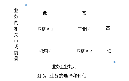 在調(diào)整區(qū)2中,城投公司在該業(yè)務(wù)上能力較強(qiáng),但潛在的市場(chǎng)空間卻有限,公司也應(yīng)當(dāng)做出調(diào)整;如果集中資源能夠搶占競(jìng)爭(zhēng)對(duì)手的市場(chǎng),則應(yīng)積極進(jìn)入該業(yè)務(wù)領(lǐng)域,否則看這種能力是否能夠轉(zhuǎn)移,如果不能轉(zhuǎn)移,在盈利的情況下繼續(xù)經(jīng)營。