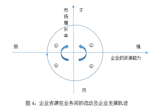 業(yè)務(wù)開始都是企業(yè)資源能力較弱,市場(chǎng)增長率很強(qiáng),企業(yè)會(huì)注入資源;然后業(yè)務(wù)的企業(yè)能力變強(qiáng),市場(chǎng)增長率會(huì)很高,企業(yè)繼續(xù)投入資源。但過了高增長期之后,該業(yè)務(wù)的增長率會(huì)降低,降低的原因是由于市場(chǎng)競(jìng)爭(zhēng)者增多導(dǎo)致的。如果企業(yè)處于比較劣勢(shì)的地位,那么業(yè)務(wù)就會(huì)處于負(fù)增長,企業(yè)就應(yīng)從中抽取資源投入有潛力或增長趨勢(shì)正強(qiáng)勁的業(yè)務(wù)。該業(yè)務(wù)的企業(yè)能力隨著資源的逐漸減少,業(yè)務(wù)能力弱化,企業(yè)進(jìn)入第三象限,直至該業(yè)務(wù)消亡。