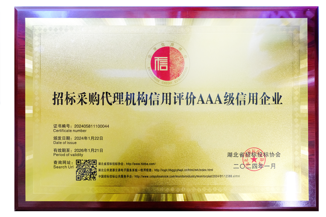 近日,鼎正憑借誠信的經營理念、良好的企業信譽和優質的服務質量,榮獲由湖北省招標投標協會認定的最高等級“招標采購代理機構信用評價AAA級信用企業”稱號。