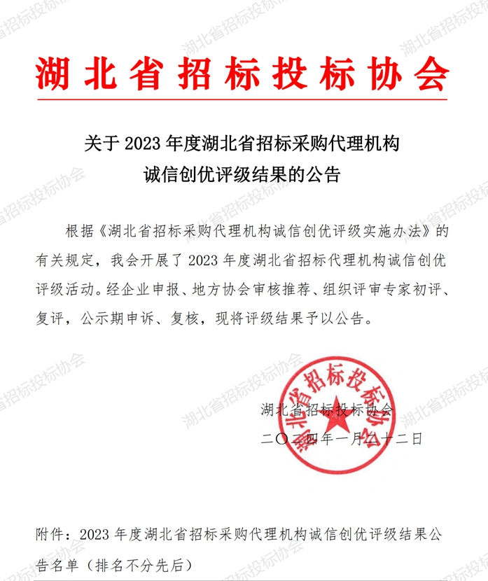 此次評選是湖北省招投標協會根據《關于建立完善守信聯合激勵和失信聯合懲戒制度加快推進社會誠信建設的指導意見》要求和《政府采購招標代理機構管理辦法》及相關法律法規規定,按照“自愿、公開、公平、公正、非營利”原則,在會員單位內開展“湖北省招標投標行業招標采購代理機構誠信創優評級”活動。