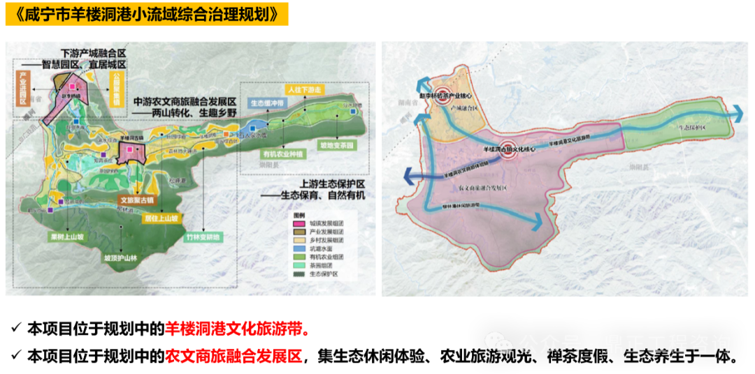 堅持下位規劃服從上位規劃、下級規劃服務上級規劃,形成流域治理“一盤棋”。落實上位規劃對本項目的定位、功能、治理重點等的相關要求,找準自身工作的側重點以及與全局工作的結合點,才能保證設計“不偏題”。以本項目為例,上位規劃將羊樓洞港小流域劃分為三個治理區,本項目位于農文商旅融合發展區和羊樓洞港文化旅游帶,因此本項目不僅要關注到水生態、水環境的修復提升,還要考慮流域生態價值的轉化及對旅游產業的推動,利用好流域內的茶產業特色以及茶馬古鎮的歷史文化特色,實現生態美與產業綠深度融合。