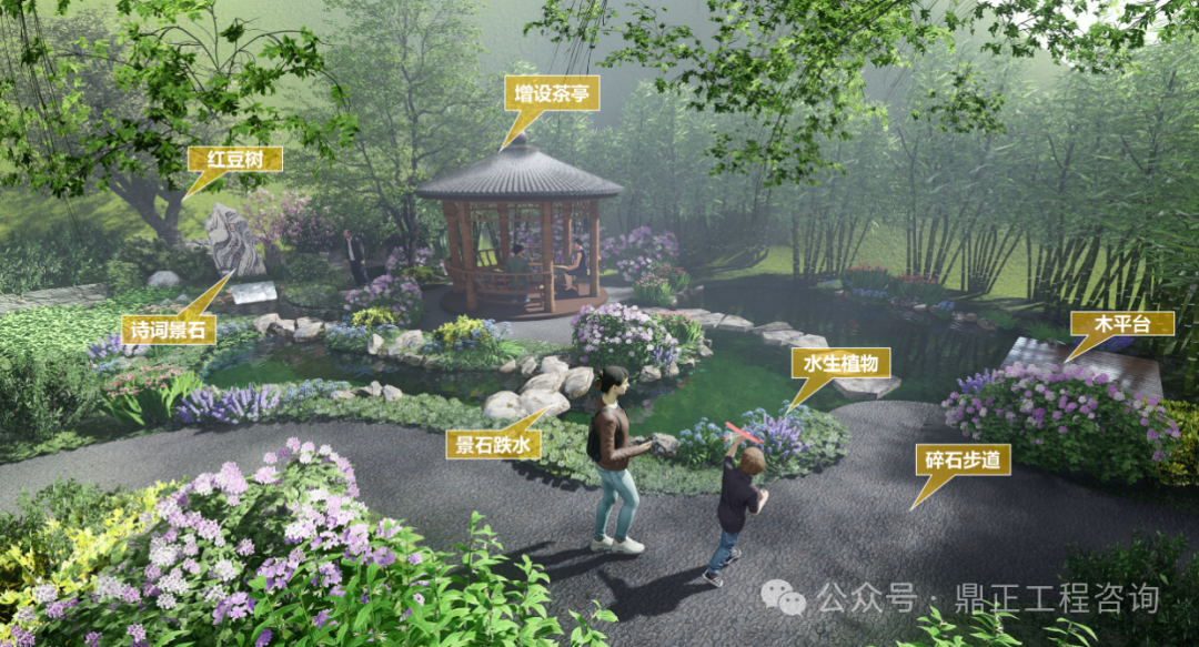 水景觀水文化打造:通過深挖相公泉歷史文化內涵,進行本地印象提煉。“相公”一詞在古代,是妻子對丈夫的稱呼,也是君子、生員(秀才、相公)、宰相的另一種叫法。君子愛茶,沏茶品茗,修煉品性,以茶可雅志,茶是象征著塵世的純潔。設計從自然山水出發,落位于閑情逸致設計基調,泉眼處采用題字景石配上一棵姿態旖旎的紅豆,視線端頭一幅竹影錦鯉、花木跌水的畫面映入眼簾,兩側的樹木林立,開合有致,整個節點的中心是一座圓頂茶亭,在亭中,一壺清茶問道,仿佛拉近了古今往事,也增加了場地的記憶,呈現出 “千年古樹頻招手,萬年清泉溢清香”的意境。