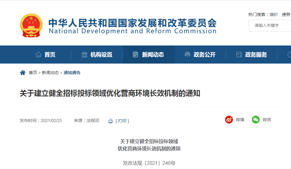 根據國務院部署要求,2019年以來,國家發展改革委聯合國務院有關部門在全國開展了工程項目招標投標領域營商環境專項整治,組織各地區、各有關部門對招標投標法規政策文件進行全面清理,廣泛征集損害營商環境問題線索,大力開展隨機抽查和重點核查,嚴肅查處破壞公平競爭的違法違規行為。通過專項整治,招標投標市場主體反映強烈的一大批突出問題得到有效解決,制度規則更加明晰,市場秩序不斷規范,不同所有制企業公平競爭的市場環境進一步形成。但應當看到,與黨中央、國務院要求相比,與廣大市場主體期盼相比,招標投標領域營商環境仍存在薄弱環節。各地招標投標法規政策文件總量偏多,規則龐雜不一,加重市場主體的合規成本;地方保護、所有制歧視、擅自設立審核備案證明事項和辦理環節、違規干預市場主體自主權等問題仍時有發生,在一些市縣還比較突出;招標投標行政管理重事前審批核準備案、輕事中事后監管,監管主動性、全面性不足,一些行業領域監管職責不清,對違法違規行為震懾不夠。為鞏固和深化招標投標領域營商環境專項整治成果,進一步營造公平競爭的市場環境,迫切要求建立健全長效機制,久久為功,持續發力,推動招標投標領域營商環境實現根本性好轉。