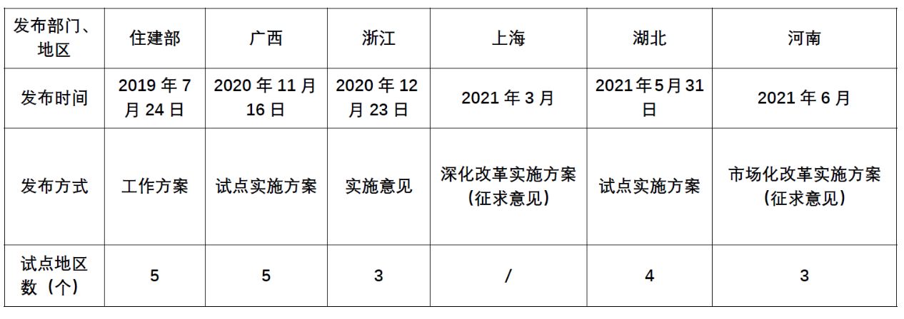 2020年7月24日,住房和城鄉(xiāng)建部辦公廳印發(fā)關(guān)于工程造價改革工作方案的通知(建辦標(biāo)〔2020〕38號,以下簡稱38號文),通知決定在北京市、浙江省、湖北省、廣東省、廣西壯族自治區(qū)等五個地區(qū)開展方案試點(diǎn)工作。截至本稿起筆日(2021.6.3),廣西、浙江和湖北等三個試點(diǎn)地區(qū)相繼發(fā)布有關(guān)方案通知,北京、廣東尚未見官方相關(guān)信息。五個試點(diǎn)城市外,上海、河南等地的方案在征求意見中。