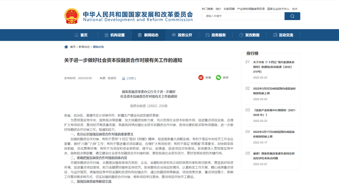3月28日,國家發(fā)展改革委辦公廳印發(fā)《關(guān)于進(jìn)一步做好社會(huì)資本投融資合作對(duì)接有關(guān)工作的通知》(以下簡稱《通知》),部署各地積極采取有效措施,進(jìn)一步做好投融資合作對(duì)接工作。