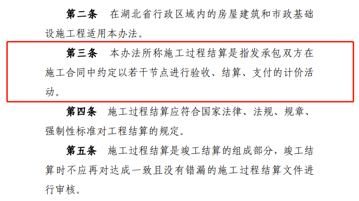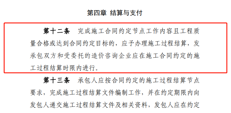 本條定義何為施工過程結(jié)算,相較住建部2021年發(fā)布的《建筑工程施工發(fā)包與承包計價管理辦法》(修訂征求意見稿)第十九條規(guī)定“全面推行施工過程結(jié)算和支付。發(fā)承包雙方通過合同約定,按時間節(jié)點(diǎn)或進(jìn)度節(jié)點(diǎn)對周期內(nèi)已完成且無爭議的工程量進(jìn)行價款計算、確認(rèn),并按照合同約定比例支付。”《暫行辦法》增加了節(jié)點(diǎn)驗收,驗收是節(jié)點(diǎn)結(jié)算與支付的前提。