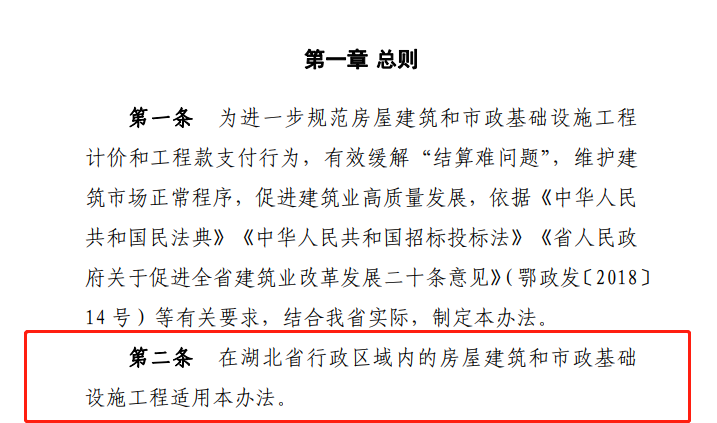 自本辦法實(shí)施之日起,湖北省內(nèi)的房屋建筑和市政基礎(chǔ)設(shè)施工程適用本辦法,不區(qū)分資金性質(zhì)。施工工程是否必須適用本《暫行辦法》,則需結(jié)合項目進(jìn)展情況而定:已進(jìn)行招投標(biāo)或已簽訂合同的工程,仍按原約定執(zhí)行,已發(fā)包暫未確定中標(biāo)單位的,招標(biāo)人可發(fā)布澄清公告對結(jié)算方式進(jìn)行變更,也可以按原約定繼續(xù)進(jìn)行。