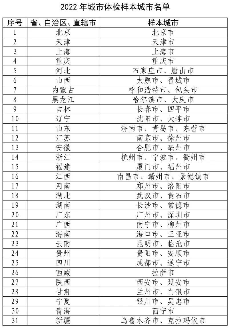為深入貫徹習近平總書記關于建立城市體檢評估機制的重要指示精神,落實中共中央辦公廳、國務院辦公廳印發的《關于推動城鄉建設綠色發展的意見》部署要求,經協商研究,在歷年城市體檢工作基礎上,決定繼續選取直轄市、計劃單列市、省會城市和部分設區城市(見附件1,以下簡稱樣本城市)開展2022年城市體檢工作?,F將有關事項通知如下: