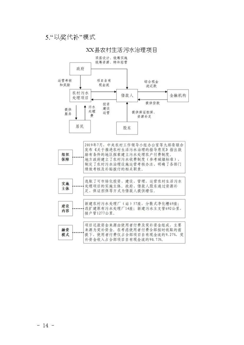 (五)多措并舉,創(chuàng)新模式。地方政府統籌安排,為符合條件的項目爭取多元化的資金,豐富項目資金籌措渠道。鼓勵支持市場化方式運營的項目,包含政府與社會資本合作(PPP)、特許經營,以及環(huán)境綜合治理托管、環(huán)境污染第三方治理、生態(tài)環(huán)境導向的開發(fā)(EOD)等模式。