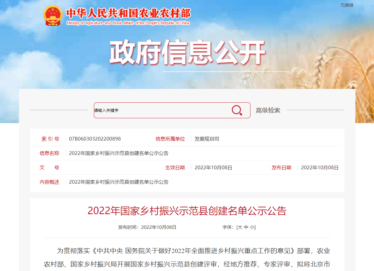 農(nóng)業(yè)農(nóng)村部、國家鄉(xiāng)村振興局開展國家鄉(xiāng)村振興示范縣創(chuàng)建評審,經(jīng)地方推薦、專家評審,擬將北京市大興區(qū)等100個申報單位納入2022年國家鄉(xiāng)村振興示范縣創(chuàng)建名單,湖北省4地入圍。