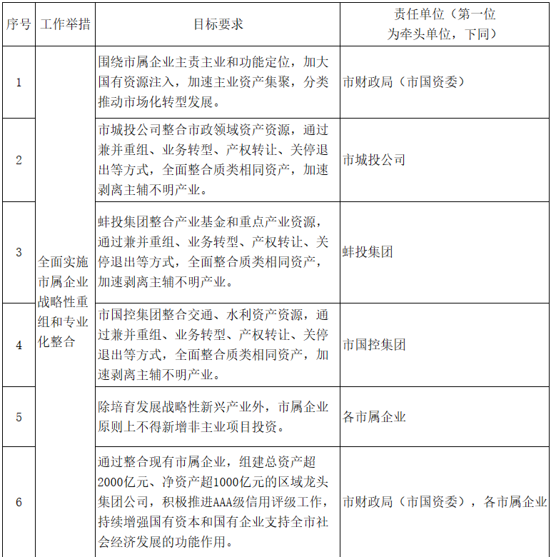1.全面實(shí)施市屬企業(yè)戰(zhàn)略性重組和專業(yè)化整合。圍繞市屬企業(yè)主責(zé)主業(yè)和功能定位,加大國(guó)有資源注入,加速主業(yè)資產(chǎn)集聚,分類推動(dòng)市場(chǎng)化轉(zhuǎn)型發(fā)展。市城投公司整合市政領(lǐng)域資產(chǎn)資源,蚌投集團(tuán)整合產(chǎn)業(yè)基金和重點(diǎn)產(chǎn)業(yè)資源,市國(guó)控集團(tuán)整合交通、水利資產(chǎn)資源,通過(guò)兼并重組、業(yè)務(wù)轉(zhuǎn)型、產(chǎn)權(quán)轉(zhuǎn)讓、關(guān)停退出等方式,全面整合質(zhì)類相同資產(chǎn),加速剝離主輔不明產(chǎn)業(yè)。除培育發(fā)展戰(zhàn)略性新興產(chǎn)業(yè)外,市屬企業(yè)原則上不得新增非主業(yè)項(xiàng)目投資。在此基礎(chǔ)上,通過(guò)整合現(xiàn)有市屬企業(yè),組建總資產(chǎn)超2000億元、凈資產(chǎn)超1000億元的區(qū)域龍頭集團(tuán)公司,積極推進(jìn)AAA級(jí)信用評(píng)級(jí)工作,持續(xù)增強(qiáng)國(guó)有資本和國(guó)有企業(yè)支持全市社會(huì)經(jīng)濟(jì)發(fā)展的功能作用。〔責(zé)任單位:市財(cái)政局(市國(guó)資委),各市屬企業(yè)〕