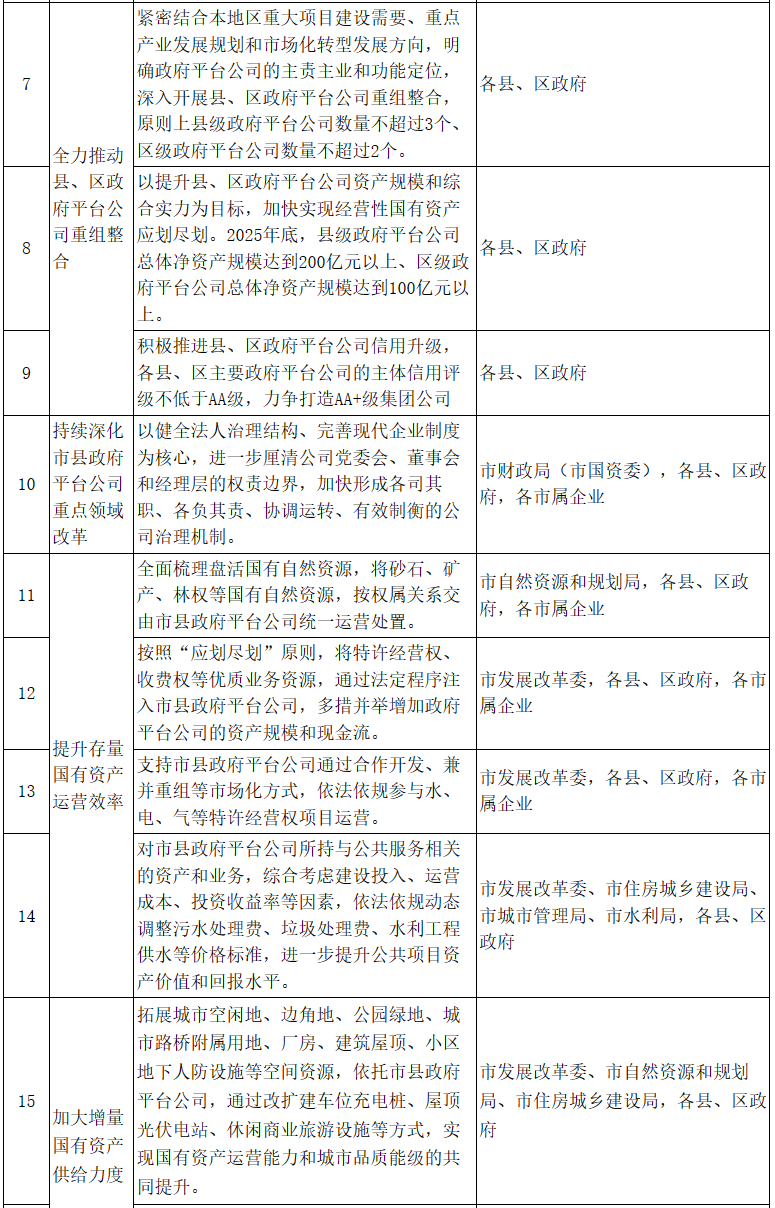 2.全力推動(dòng)縣、區(qū)政府平臺(tái)公司重組整合。各縣、區(qū)政府(市高新區(qū)管委會(huì)、市經(jīng)開區(qū)管委會(huì),下同)要緊密結(jié)合本地區(qū)重大項(xiàng)目建設(shè)需要、重點(diǎn)產(chǎn)業(yè)發(fā)展規(guī)劃和市場(chǎng)化轉(zhuǎn)型發(fā)展方向,明確政府平臺(tái)公司的主責(zé)主業(yè)和功能定位,深入開展縣、區(qū)政府平臺(tái)公司重組整合,充分發(fā)揮資源集聚優(yōu)勢(shì)。原則上縣級(jí)政府平臺(tái)公司數(shù)量不超過(guò)3個(gè)、區(qū)級(jí)政府平臺(tái)公司數(shù)量不超過(guò)2個(gè)。以提升縣、區(qū)政府平臺(tái)公司資產(chǎn)規(guī)模和綜合實(shí)力為目標(biāo),加快實(shí)現(xiàn)經(jīng)營(yíng)性國(guó)有資產(chǎn)應(yīng)劃盡劃。2025年底,縣級(jí)政府平臺(tái)公司總體凈資產(chǎn)規(guī)模達(dá)到200億元以上、區(qū)級(jí)政府平臺(tái)公司總體凈資產(chǎn)規(guī)模達(dá)到100億元以上。積極推進(jìn)縣、區(qū)政府平臺(tái)公司信用升級(jí),各縣、區(qū)主要政府平臺(tái)公司的主體信用評(píng)級(jí)不低于AA級(jí),力爭(zhēng)打造AA+級(jí)集團(tuán)公司。(責(zé)任單位:各縣、區(qū)政府)