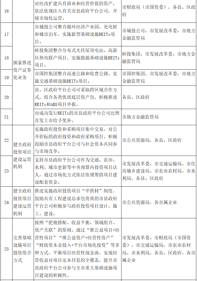 6.探索推進(jìn)資產(chǎn)證券化業(yè)務(wù)。市城投公司整合循環(huán)經(jīng)濟(jì)產(chǎn)業(yè)園、充電樁和城市泊車,實(shí)施新型基礎(chǔ)設(shè)施REITs項(xiàng)目;蚌投集團(tuán)整合分布式光伏屋頂電站、高新區(qū)熱電聯(lián)產(chǎn)項(xiàng)目,實(shí)施能源基礎(chǔ)設(shè)施REITs項(xiàng)目;市國(guó)控集團(tuán)整合高速公路和收費(fèi)公路,實(shí)施交通基礎(chǔ)設(shè)施REITs項(xiàng)目。縣、區(qū)政府平臺(tái)公司可采取跨區(qū)域合作方式,組合各類優(yōu)質(zhì)底層資產(chǎn)包,積極推進(jìn)REITs和ABS項(xiàng)目申報(bào)。2025年底前,市屬企業(yè)力爭(zhēng)發(fā)行REITs不低于2支,募集資金規(guī)模不低于50億元。對(duì)成功發(fā)行REITs的市縣政府平臺(tái)公司比照首發(fā)上市給予獎(jiǎng)補(bǔ)。(責(zé)任單位:市發(fā)展改革委、市地方金融監(jiān)管局、各縣、區(qū)政府,各市屬企業(yè))