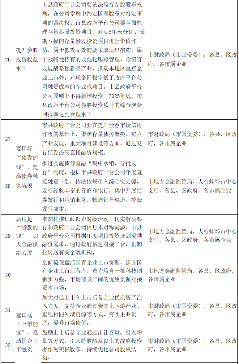 (四)持續(xù)提升融資能力。2025年底,市屬企業(yè)培育2戶以上國(guó)有控股企業(yè)在主要資本市場(chǎng)成功上市。市縣政府平臺(tái)公司直接融資規(guī)模超過(guò)300億元,間接融資規(guī)模超過(guò)400億元。