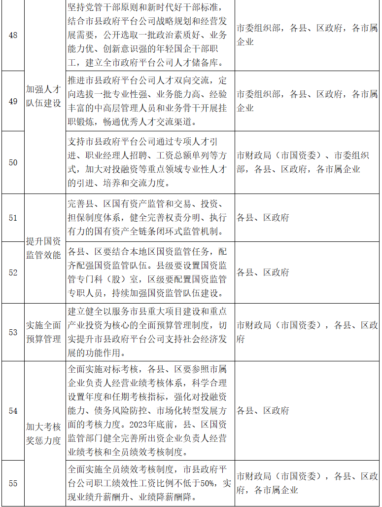 19.提升國(guó)資監(jiān)管效能。切實(shí)將提升國(guó)資監(jiān)管效能作為促進(jìn)政府平臺(tái)公司市場(chǎng)化轉(zhuǎn)型和高質(zhì)量發(fā)展的重要抓手,認(rèn)真謀劃符合本地區(qū)政府平臺(tái)公司實(shí)際的改革深化措施。完善縣、區(qū)國(guó)有資產(chǎn)監(jiān)管和交易、投資、擔(dān)保制度體系,建立健全權(quán)責(zé)分明、執(zhí)行有力的國(guó)有資產(chǎn)全鏈條閉環(huán)式監(jiān)管機(jī)制。各縣、區(qū)要結(jié)合本地區(qū)國(guó)資監(jiān)管任務(wù),配齊配強(qiáng)國(guó)資監(jiān)管隊(duì)伍。縣級(jí)要設(shè)置國(guó)資監(jiān)管專門科(股)室,區(qū)級(jí)要配置國(guó)資監(jiān)管專職人員,持續(xù)加強(qiáng)國(guó)資監(jiān)管隊(duì)伍建設(shè)。(責(zé)任單位:各縣、區(qū)政府)