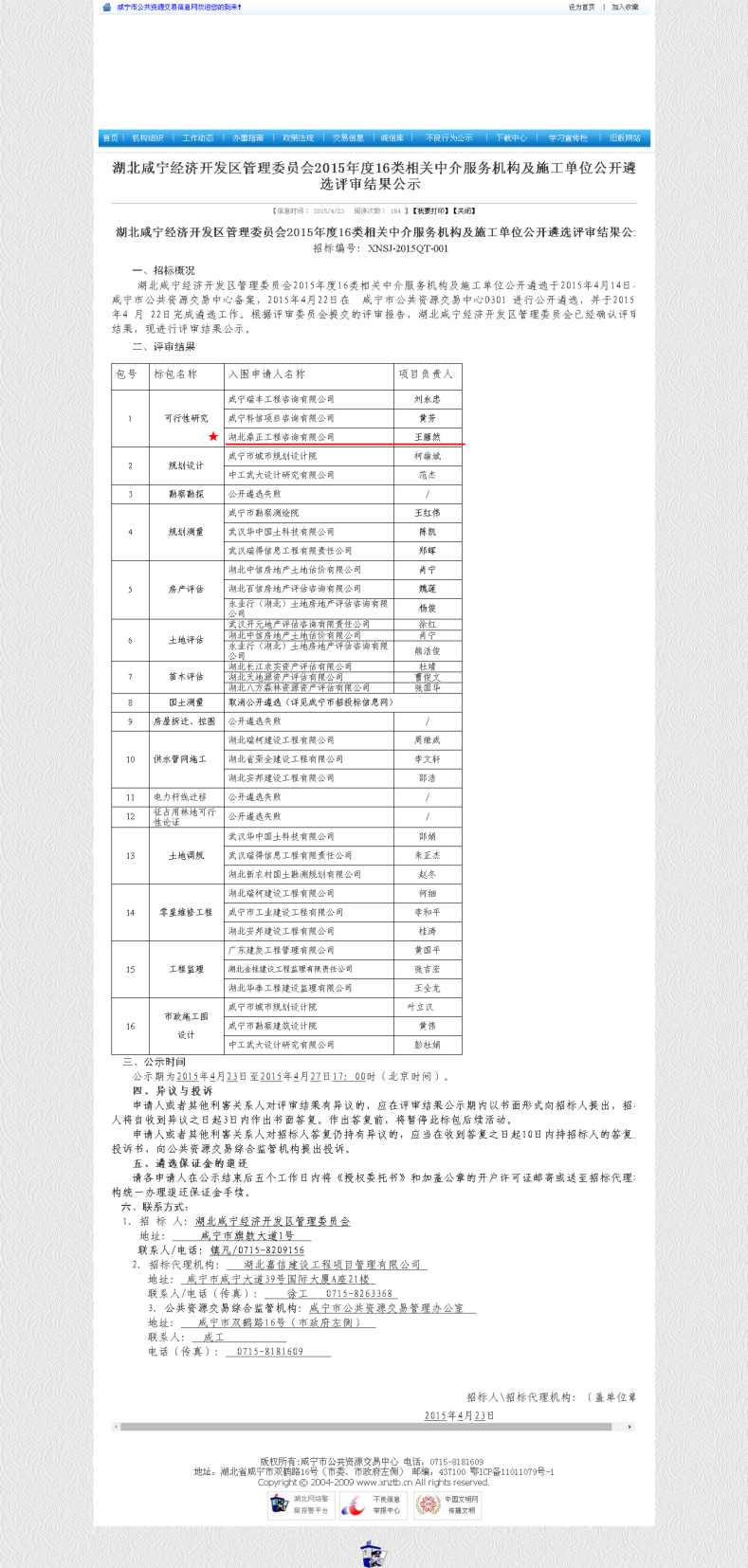 【經營成果】我司入圍湖北咸寧經濟開發區管理委員會2015年度16類相關中介服務機構的可行性研究單位