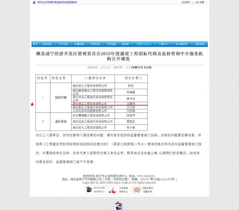【經(jīng)營成果】我司入圍湖北咸寧經(jīng)濟開發(fā)區(qū)管理委員會2015年度建設(shè)工程招標(biāo)代理及造價咨詢中介服務(wù)機構(gòu)庫招標(biāo)代理單位