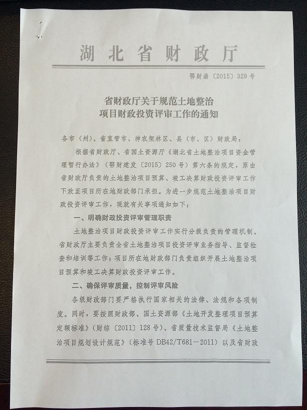 湖北省財政廳關(guān)于規(guī)范土地整治項目財政投資評審工作的通知
