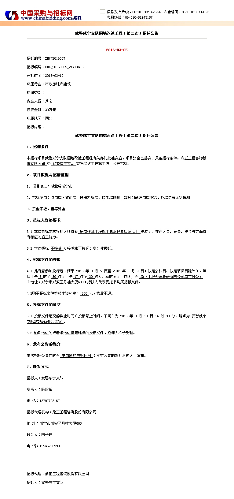武警咸寧支隊圍墻改造工程(第二次)招標(biāo)公告