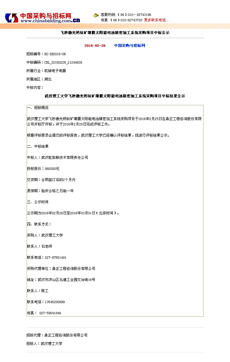 飛秒激光鈣鈦礦薄膜太陽能電池精密加工系統采購項目中標公示